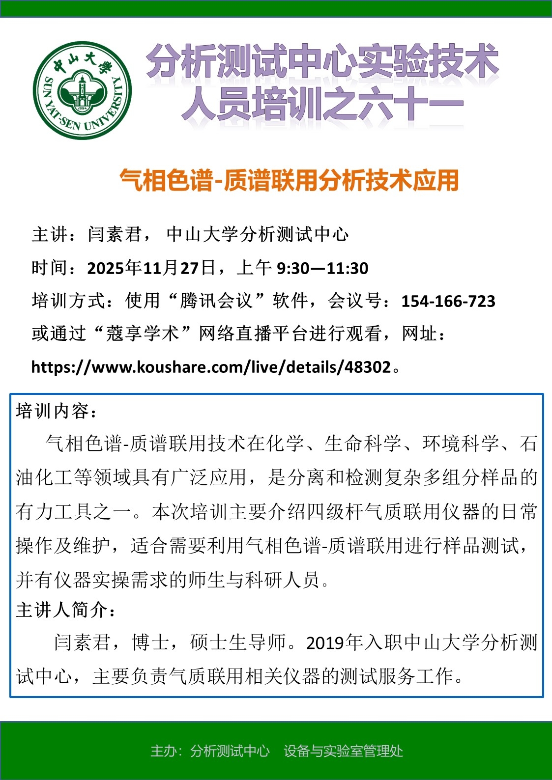 导航痕迹 中山大学分析测试中心 分析测试中心实验技术人员培训之六十一:气相色谱-质谱联用分析技术应用 扫描此二维码分享 分析测试中心实验技术人员培训之六十一:气相色谱-质谱联用分析技术应用 发布人:张锦 发布日期:2025-11-18