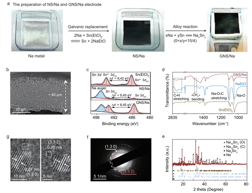 由于该电极材料对空气高度敏感,其表征工作面临较大挑战。为此,研究团队依托分析测试中心的透射电子显微镜(FEI Tecnai G2 F30),系统优化了样品制备流程,并完成了前期样品的筛选工作。同时,X射线光电子能谱(ESCALAB Xi+)分析从化学态层面提供了决定性数据:不仅证实了前驱体中Sn²⁺被成功还原为金属锡,验证了制备反应路径;其深度剖析功能进一步揭示,循环后电极表面覆盖了一层富含NaF、Na₂O等稳定成分的SEI膜,且未检测到钠枝晶沉积,从界面化学角度阐明了该电极高稳定性和无枝晶特性的根本原因。这些由本中心设备获得的关键证据,与扫描电镜、X射线衍射等辅助表征结果相互印证(图2),共同证实了通过原位化学置换与热处理成功构建了成分与电势梯度的新型负极结构,为其卓越的电化学性能奠定了坚实的科学与数据基础。