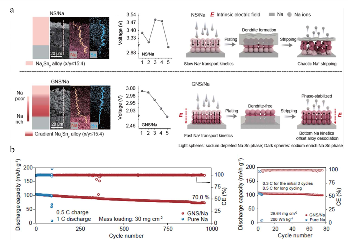 近日,中山大学材料科学与工程学院雷丹妮教授、王成新教授团队针对性破解这一难题,成功构建梯度锡钠合金 / 金属钠双层负极(GNS/Na),为钠电池实用化迈出关键一步。该设计颠覆传统单一 “抑枝晶” 或 “补钠” 思路,在结构设计上实现了核心问题突破:上层梯度钠锡合金相作为离子缓冲层,同步优化离子存储热力学与离子传输动力学,从根源抑制枝晶生长;下层金属钠充当动态钠离子 “储库”,既保障上层合金相结构稳定,又高效弥补长循环中活性钠的损耗,一举解决枝晶、Na⁺损耗、电极/电解质界面不稳定三大痛点。性能验证显示,该改性负极与30 mg cm⁻² 高载量磷酸钒钠正极匹配的全电池,能量密度突破200 Wh kg⁻¹,且实现稳定长循环,完美适配工业级高能量密度、长寿命需求。更重要的是,这种 “梯度双层结构” 重新定义了钠电池负极设计逻辑,其核心原理可推广至钾电池、锂金属电池等后锂电池体系,为高能电池的电极创新提供了通用范式。