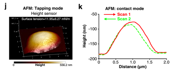中山大学测试中心原子力显微镜机组经过与文章第一作者王云龙博士的讨论,确定了在云母基底表面修饰极性基团固定冷凝液滴的制样方法,再通过峰值力轻敲模式,成功地在液相环境下获得了蛋白复合物冷凝液滴的表面形貌图;通过原子力显微镜测量力学谱的方法,给出了液滴表面张力的范围值。从而在形貌和力学上对蛋白复合物冷凝液滴进行了精准表征。
