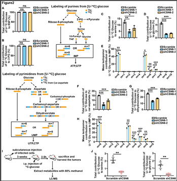 2023年2月,中山大学附属第六医院方乐堃研究员/李孟鸿教授/兰平教授团队合作,阐明了CSN6可泛素化调控DDX5-PHGDH轴从而影响核苷酸合成,最终诱导结直肠癌的发生发展和耐药,为改善结直肠癌的治疗提供了潜在的治疗靶点。通过碳13标记的葡萄糖结合LC-MS技术,深入分析了敲低CSN6对体内外核苷酸(嘌呤及嘧啶)代谢流的影响,其结果提示沉默CSN6能显著减少丝氨酸和甘氨酸的合成总量,且能明显抑制葡萄糖进入丝氨酸和甘氨酸代谢流,最终导致肌苷一磷酸合成明显减少。同时,敲低CSN6导致氨甲酰天冬氨酸及二氢乳清酸合成明显减少,最终抑制葡萄糖提供碳给尿苷一磷酸合成。测试中心高分辨液质联用仪支撑表征了该工作中基于碳13标记的葡萄糖结合LC-MS技术的代谢流分析。